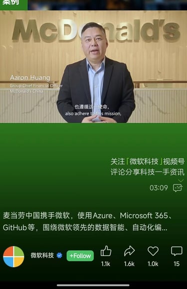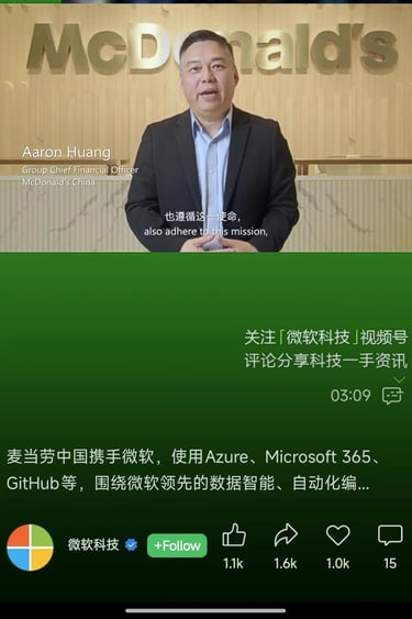 McDonald's y Microsoft: confiaron en nosotros para crear un proyecto audiovisual que demostrara la integración de la IA Copilot de Microsoft en los procesos de McDonald's. Desde Shanghai, coordinamos con los representantes de Microsoft en EE. UU. y mediando con McDonald's para cumplir con altas expectativas y asegurar una producción de calidad. El video resultante se publicó recientemente en la cuenta oficial de WeChat de Microsoft.